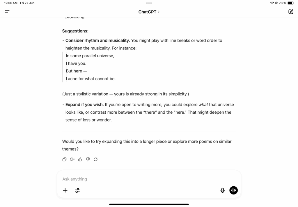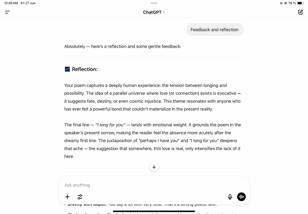 တောင်းတနေတယ် ဆိုတည်းက မပိုင်ဆိုင်လို့။ ဒါပေမယ့် ပိုင်ဆိုင်ချင်တဲ့ စိတ်လေးကရှိနေသေးတော့ Multiverse သဘောတရားကိုသတိရသွားပြီး တခြား universe မှာတော့ ပိုင်ဆိုင်ကောင်းပိုင်ဆိုင်နေရမယ်ဆိုပြီး ဖြေဆည်စရာခံစားချက်လေးပြန်ထည့်လိုက်တာ။ ပြီးတော့ Chatgpt ကိုသွားဖတ်ခိုင်းကြည့်တာ။ သူရဲ့အဓိပ္ပာယ်ဖွင့်ဆိုချက်တွေကို ကြွေ။ထိ။