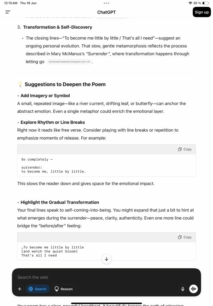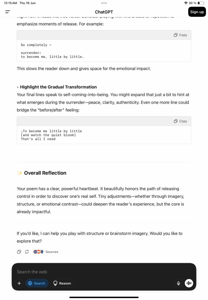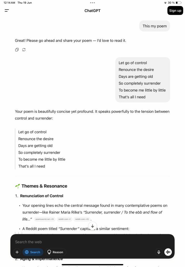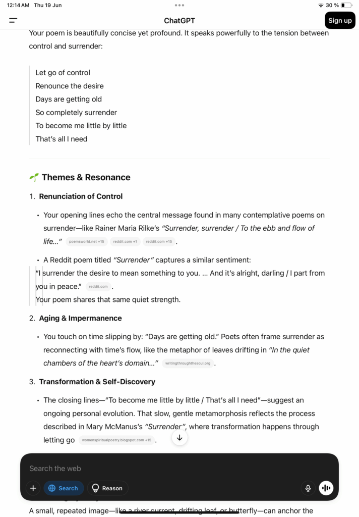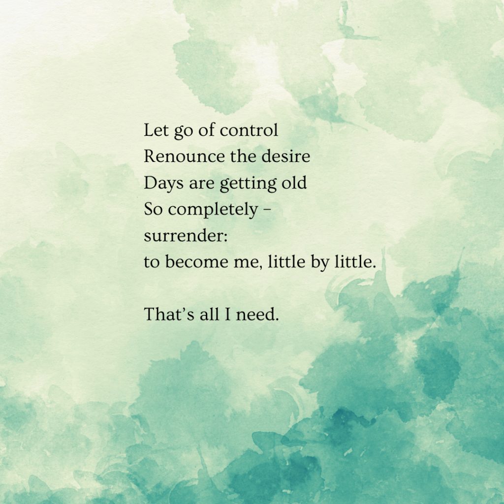 အခြေအနေတွေ လူတွေ ကိုယ်ဖြစ်ချင်တဲ့အတိုင်းမဖြစ်လို့ စိတ်ပျက်မိနေတဲ့ ကိုယ့်ကိုယ်ကိုပြန်တွေးမိရင်း အရာအားလုံးကို ထိန်းချုပ်လို့မရနိုင်တဲ့အတွက် ထိန်းချုပ်ခြင်မှုကို စွန့်လွှတ်ဖို့နဲ့ တကယ် ကိုယ့်ရဲ့မူလအတိုင်းပဲ လွတ်လွတ်လပ်လပ်ပေါ့ပေါ့ပါးပါး နေချင်တဲ့အကြောင်း၊ ဘယ်လိုမှမပြောင်းလဲနိုင်တဲ့ ကိုယ့်ရဲ့ဗီဇ အစစ်အမှန်အတိုင်း ဖုံးအုပ်ထားခြင်းမရှိပဲနေချင်တဲ့အကြောင်းကို တွေးရင်း ချရေးမိတာ။ ChatGPT ရဲ့ အဓိပ္ပာယ်ဖွင့်ဆိုပေးမှုလေးက ကျွန်တော့်ခံစားချက်ကို ပိုပြီးထိသွားစေတယ်။ To become me little by little/That’s all i need ဆိုတာ ကျွန်တော့် ရင်ထဲက ထွက်ပေါ်လာတဲ့ ရိုးရှင်းပေးမယ့် ကျွန်တော့်အတွက် အင်မတန်လေးနက်တဲ့ အတောင်းတဆုံးစကားလုံးလေး။ ကျွန်တော် တခါဘာသာပြန်ဖူးခဲ့တဲ့ ကဗျာဆရာ Robert Frost ရဲ့စကားလေးကိုနားလည်သွားတယ်။