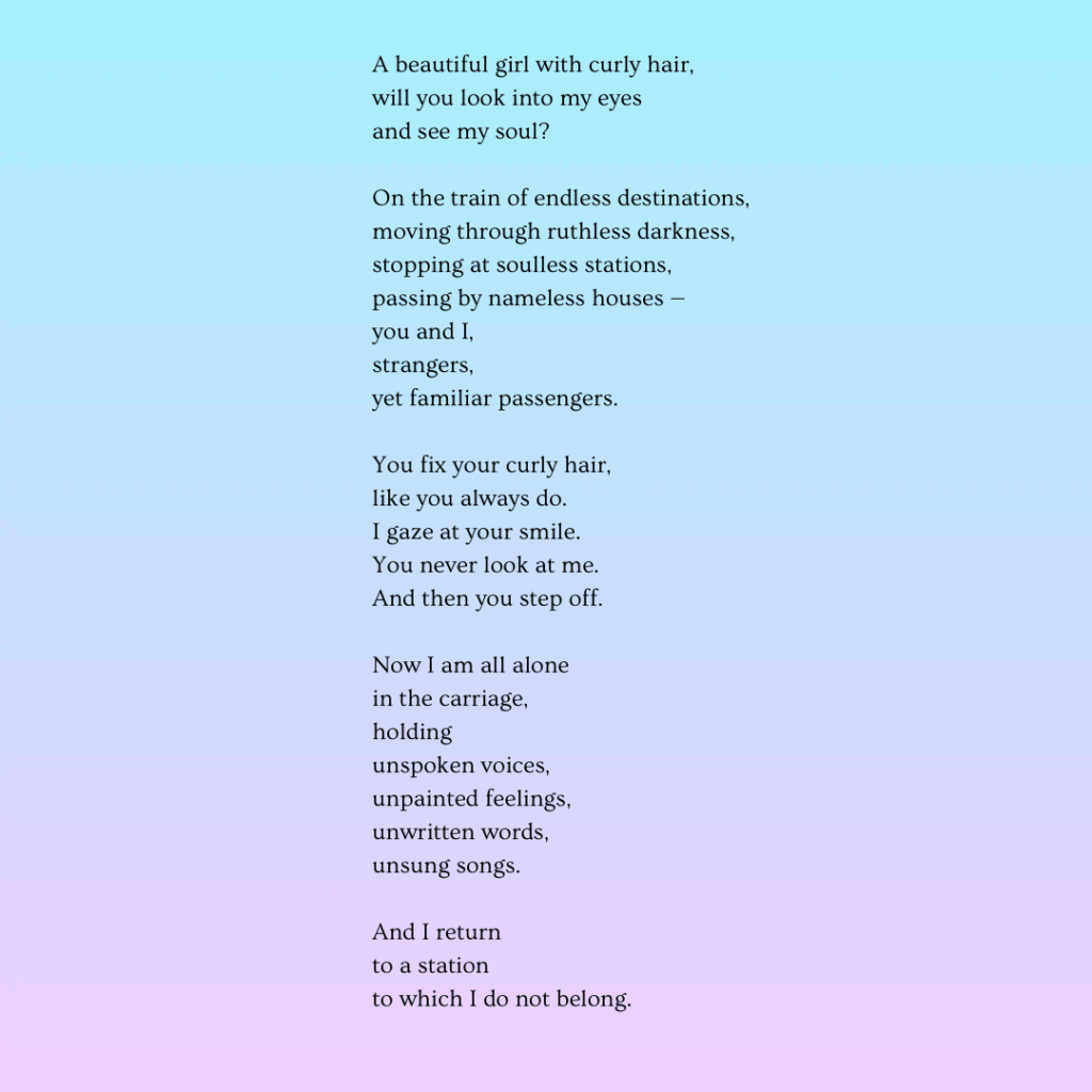 ရထားပေါ်ရောက်တော့ ရှေ့ခပ်လှမ်းလှမ်းက ဆံပင်ကောက်ကောက်နဲ့ မိန်းခလေး ထိုင်နေတာကို ကြည့်ရင်း သူကို ဗဟိုပြု အသုံးချပြီး ကျွန်တော့် ရဲ့လေးပင့်တဲ့ ခံစားချက်တွေကို ရေးလိုက်တာ။